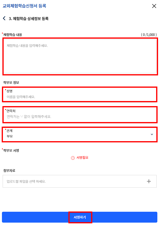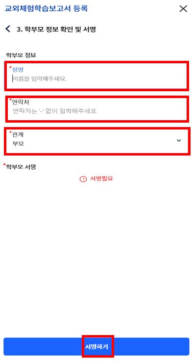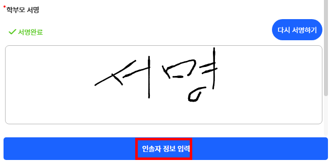 - 다음으로 넘어가 학부모의 성명, 연락처, 관계를 입력한 후 서명하기 버튼을 눌러주세요.