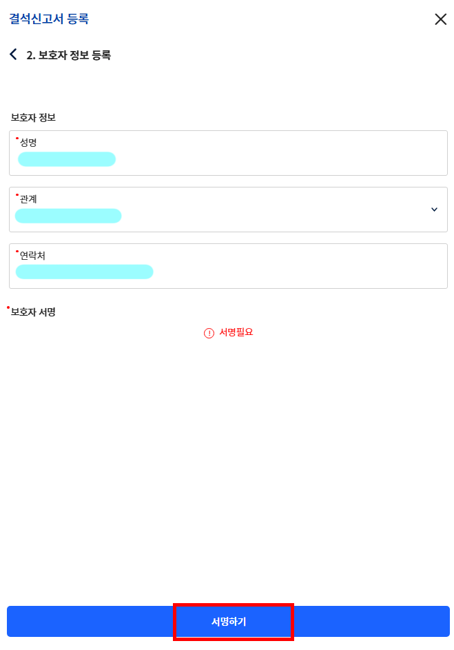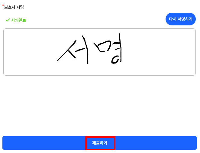 - 보호자의 서명을 위하여 서명하기 버튼을 눌러주세요.