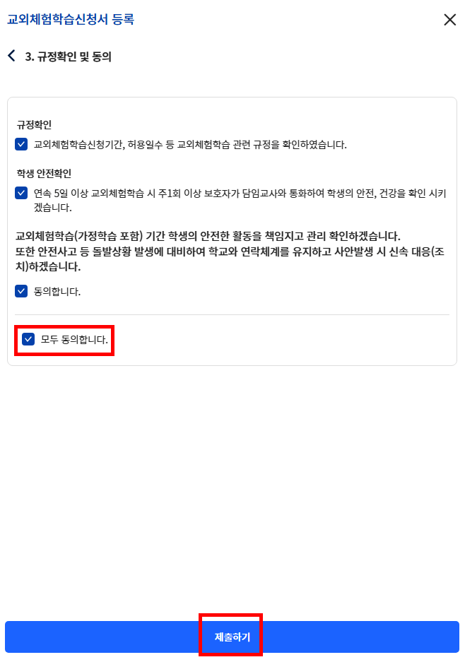 - 규정을 확인한 후 모두 동의합니다를 체크 후 제출하기를 눌러주세요.