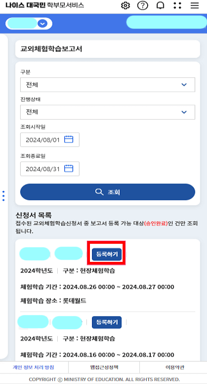 - 보고서를 등록할 체험학습을 확인한 후 등록하기를 눌러주세요.