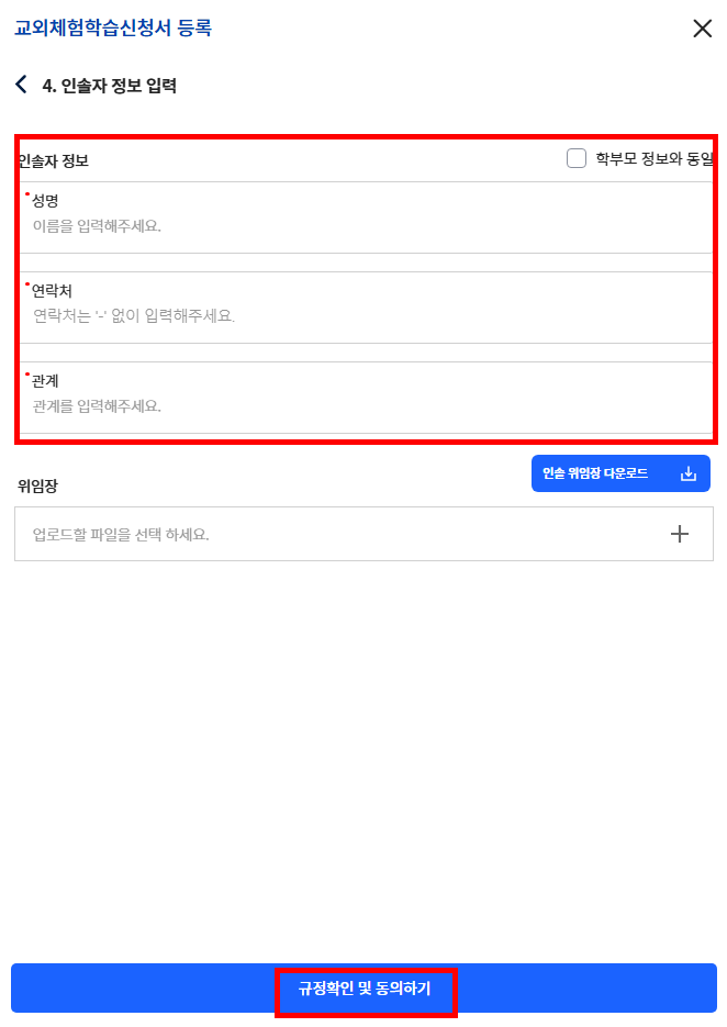- 인솔자의 성명, 연락처, 관계를 입력합니다. 인솔자가 학부모인 경우 학부모 정보와 동일을 체크합니다.