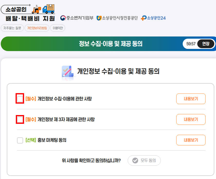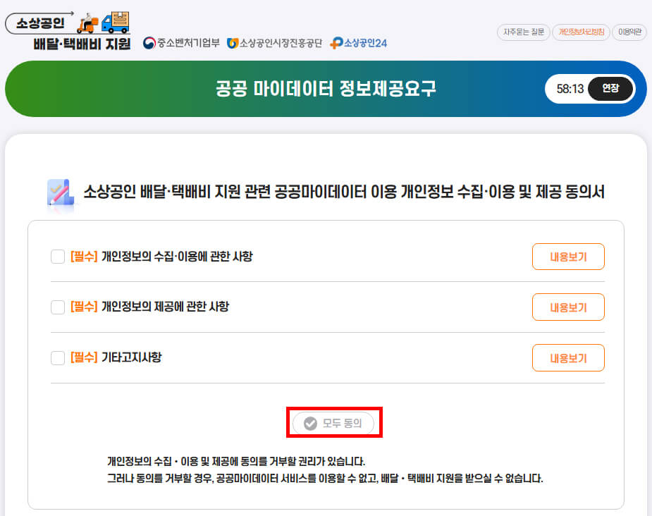 - 개인정보 수집·이용 및 제공동의 화면이 나옵니다.
