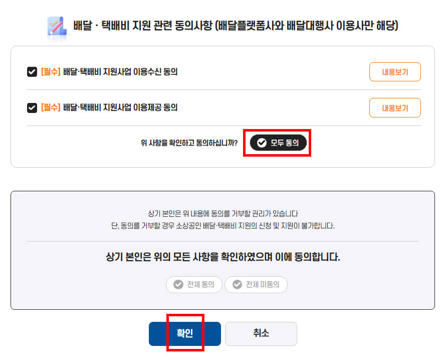 - 필수 부분을 모두 체크 후 확인을 눌러주세요.