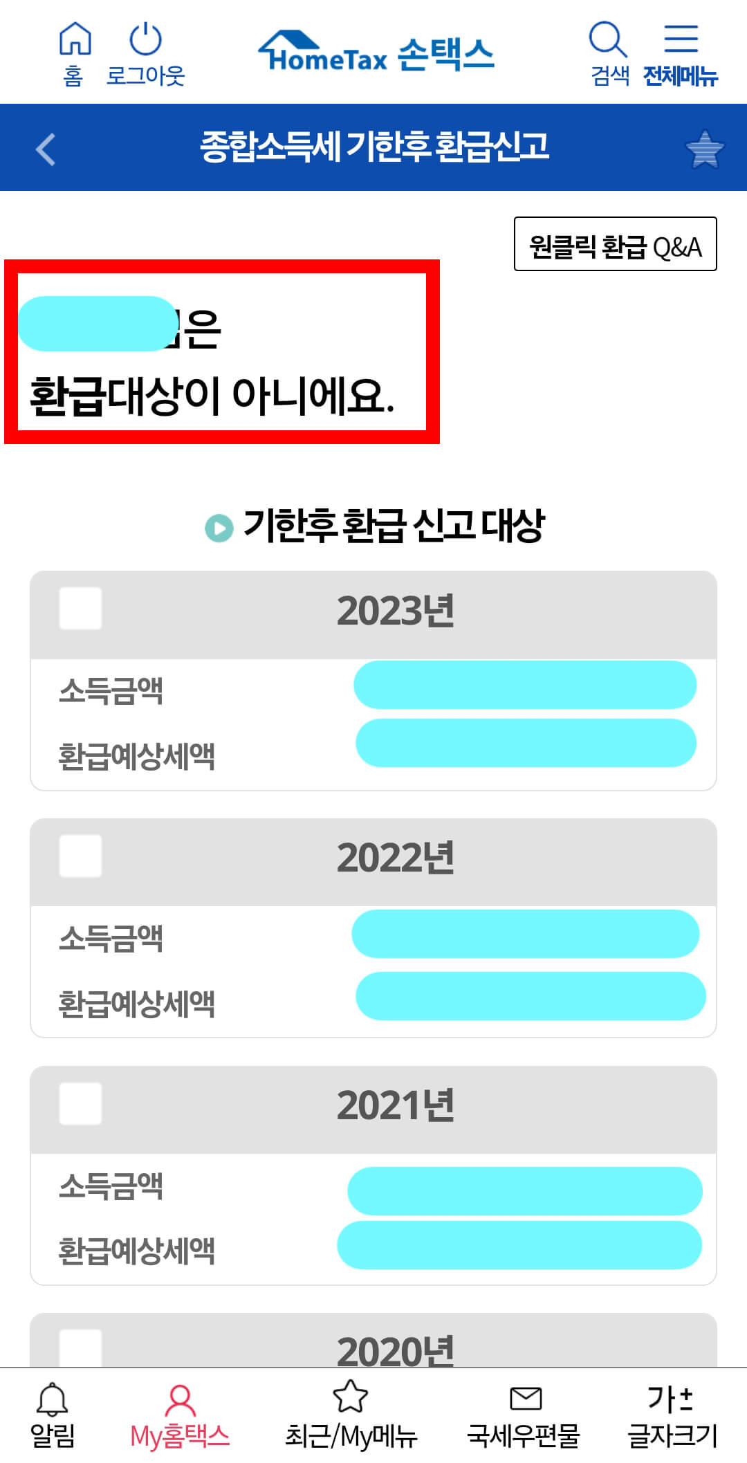 - 환급금액이 있는 경우 상단에서 환급대상이 맞다는 문구를 확인할 수 있습니다.