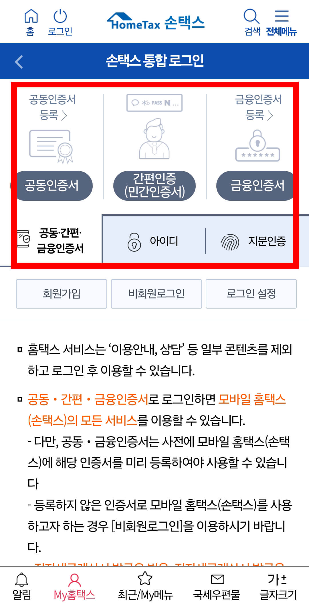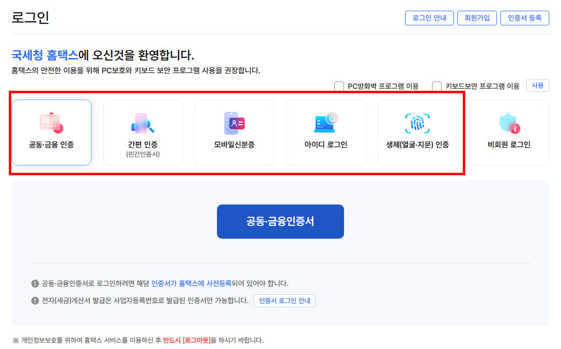 - 공동인증서, 금융인증서, 간편인증서, 아이디, 지문인증 등 편한 방법으로 로그인합니다.