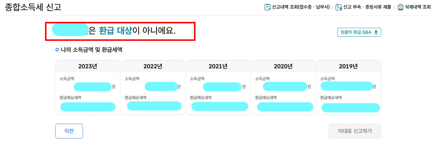 - 환급대상자인 경우 화면 하단에 이대로 신고하기 버튼 클릭